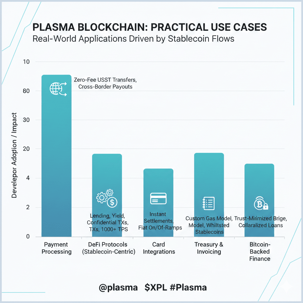 Innym praktycznym obszarem są protokoły DeFi skoncentrowane na stablecoinach. Twórcy uruchamiają skarbce pożyczkowe, strategie zysków i rynki kredytowe, które pozostają w pełni denominowane w dolarach. Przepustowość Plasma wynosząca ponad tysiąc transakcji na sekundę z blokami poniżej sekundy utrzymuje te systemy responsywne nawet w czasie dużego użytkowania. Transakcje poufne dodają dodatkową warstwę prywatności, co ma znaczenie dla skarbców biznesowych, które nie chcą, aby każdy szczegół był widoczny w łańcuchu.
