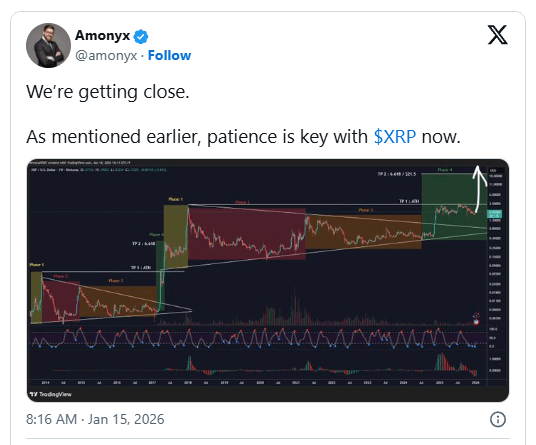 Poprzednie cykle pokazują krótkie przerwy przed kontynuacją. Stabilność cenowa powyżej 2 USD wzmacnia już istniejące strukturalne wybicie. Wiadomość Amonyxa wspiera ten pogląd. „Zbliżamy się” sygnalizuje postęp w cyklu, a nie zakończenie. Podkreślił, że „cierpliwość jest kluczem” w obecnym cyklu, a uczestnicy rynku czekają, aż XRP zakończy tę fazę.