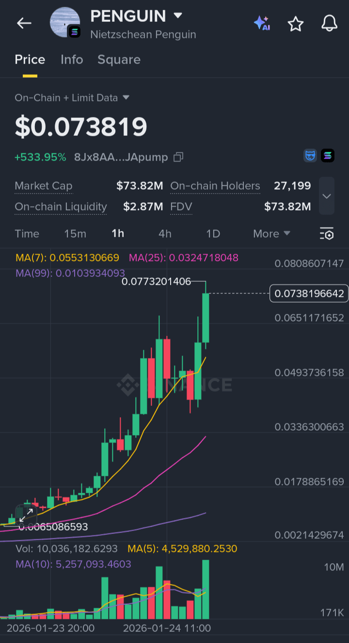 "Zapomnij o wszystkim innym, prawdziwa akcja jest tutaj! Podczas gdy rynek obserwował inne monety, PENGUIN właśnie zrealizował ogromny ruch +557%, zostawiając wszystkich w szoku! 🚀
