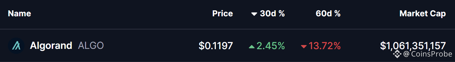 ALGO, the native token of Algorand’s Layer-1 blockchain, has shown steady but muted momentum over the past 30 days, helping slow down its broader correction. Despite this stabilization, ALGO remains down more than 13% over the last 60 days, keeping sentiment cautious across the market.