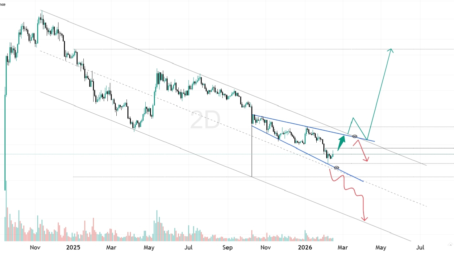Spre deosebire de un con de cădere standard, această versiune "Largitoare" indică faptul că, în timp ce prețul tinde să scadă, volatilitatea de fapt crește—un semn clasic al vânătorilor agresivi de lichiditate și al indeciziei pe piață. 🌪️