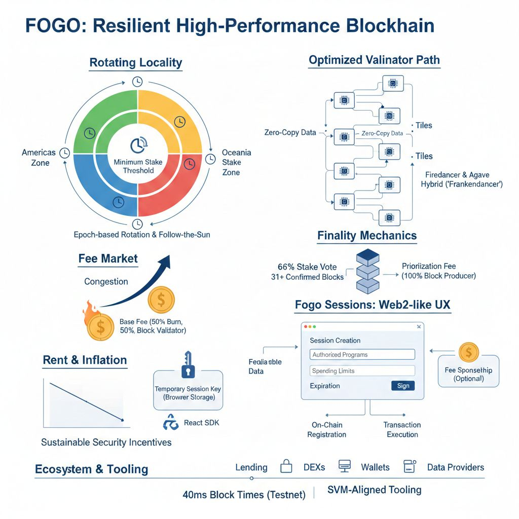 If I had to boil it down without turning it into slogans, it’s this: Fogo seems less interested in “being fast” and more interested in choosing which latencies it will inherit—and which it will design away. Localize consensus, rotate locality. Reduce the slow tail by committing to a single high-performance validator path. Make congestion behavior explicit and market-real. Remove signature fatigue so speed isn’t wasted on UX friction.