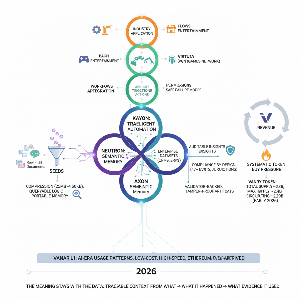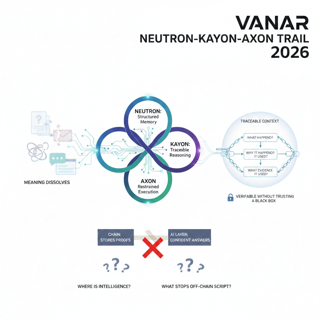 That’s the exact kind of practical headache Vanar’s Neutron + Kayon + Axon direction is trying to aim at in 2026. Not by being loud. Not by trying to sell a “futuristic vibe.” But by treating meaning like something a network can carry—structured memory, traceable reasoning, and restrained execution—so you can walk backward from “what happened” to “why it happened” to “what evidence it used,” without the whole thing collapsing into “just trust the server.”