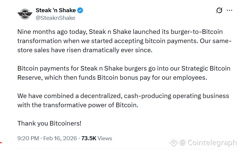 Steak ‘n Shake says its same‑store sales have “risen dramatically” since it launched a burger‑to‑Bitcoin strategy in May 2025 that routes every Bitcoin payment into a corporate treasury reserve.