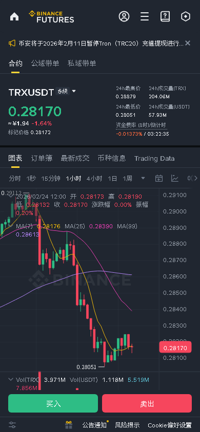 $TRX 1H级别在0.2815-0.2825窄幅震荡,处于4H下跌趋势中的短暂平衡。价格已跌破1H EMA20(0.2831)和4H EMA20(0.2850),但1H RSI(35.94)进入超卖边缘,且买盘深度(bid_ask_ratio_depth: 1.51)显示下方支撑强劲。当前是典型的【多空绞杀区】,静待1H级别放量选择方向。