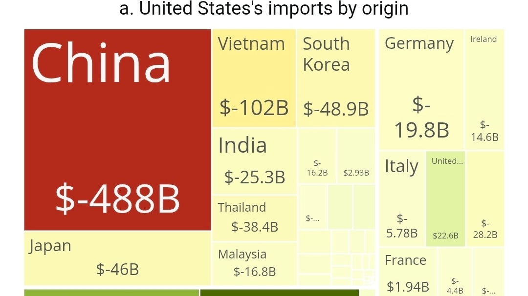 Deficitul Dominant al Chinei: China prezintă cel mai mare deficit comercial cu o marjă semnificativă, la $-488B. Acesta este reprezentat de cel mai mare bloc roșu de pe harta comercială, indicând un dezechilibru masiv în comerțul cu SUA.