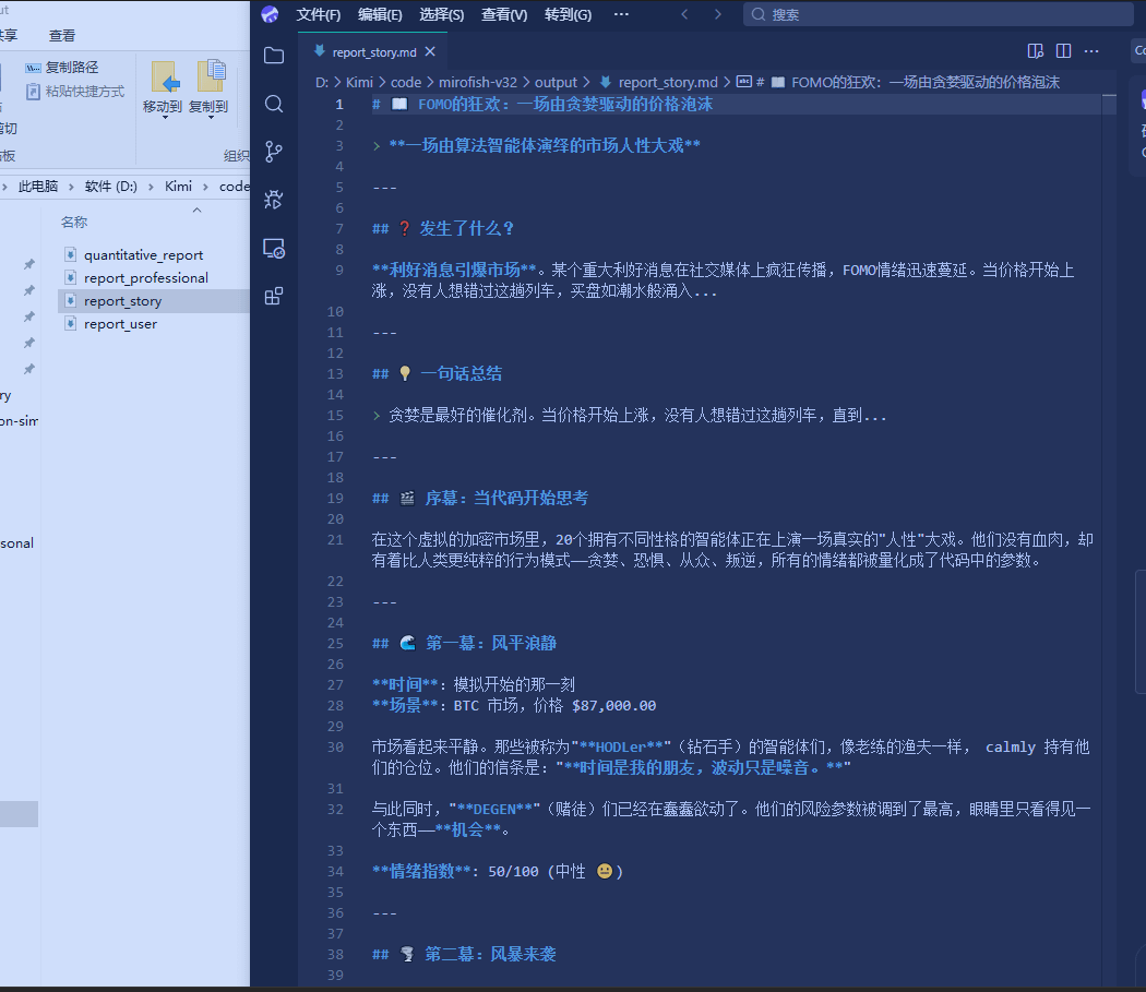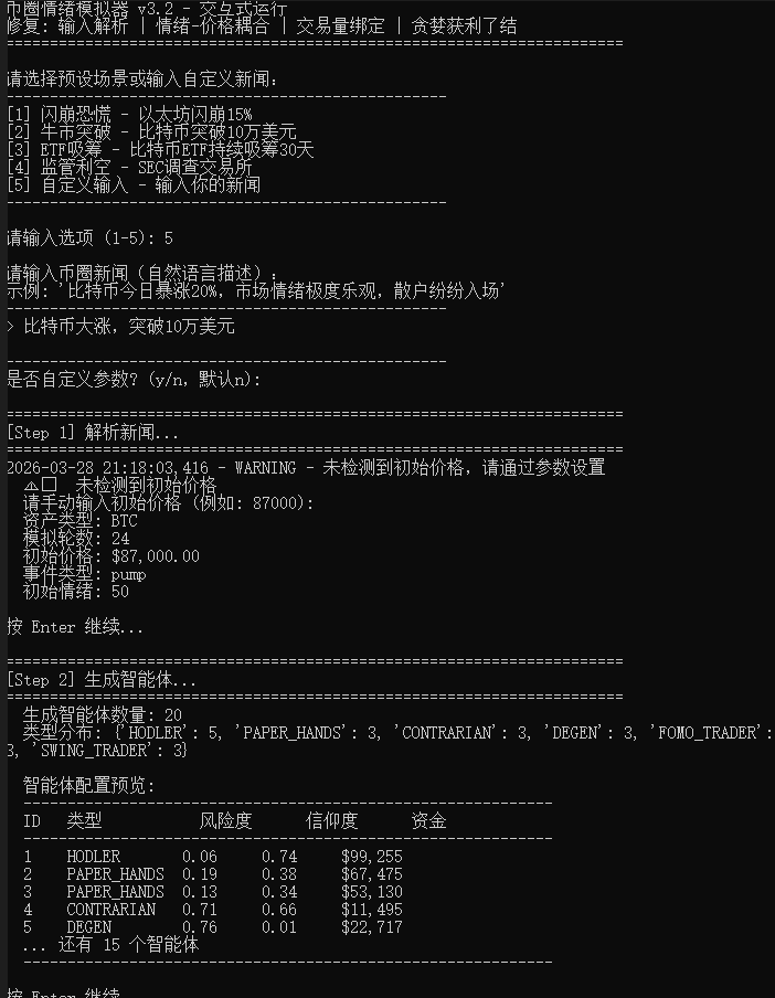 这个东东是参考了MirorFish这个项目:它不做价格预测,核心就是做「观察」:用50甚至上千个“带人性缺陷和偏见的智能体”来模拟不同类型交易者在遇到市场信息时的真实反应——有的数字人”厌恶风险“、有的有偏见、有的盲目从众、有的看空、有被恐惧支配、有人忍不住贪婪...,总之是让这群不完美的“交易者”在模拟环境里产生自主行为,而我们只需要静静观察群体反应的最终走向。