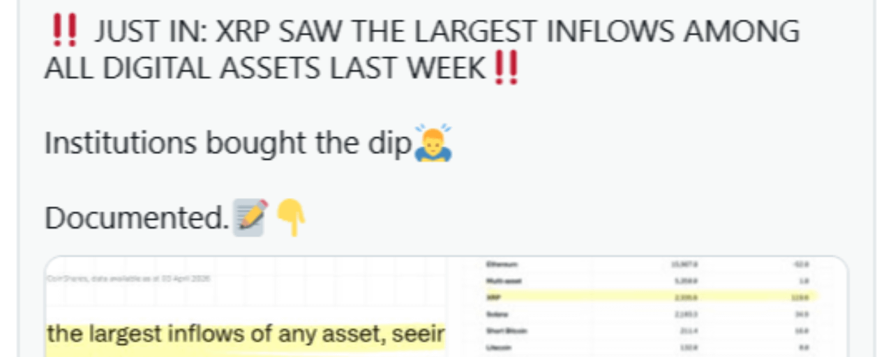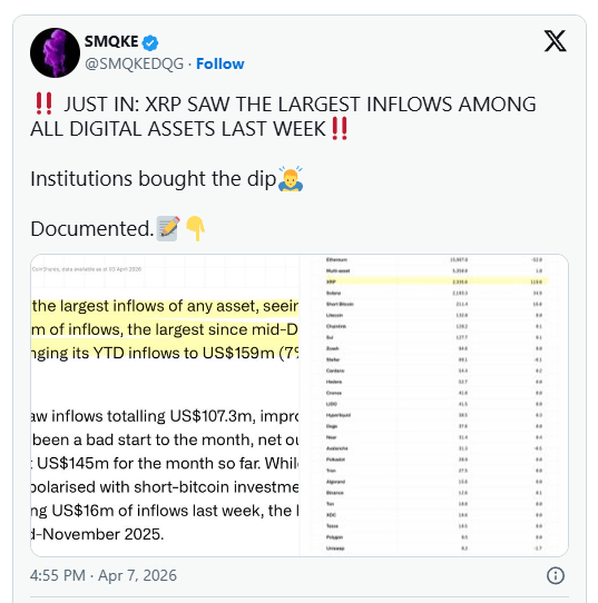 $XRP A recent post by crypto researcher SMQKE has drawn attention to new market data showing XRP leading all digital assets in weekly inflows.