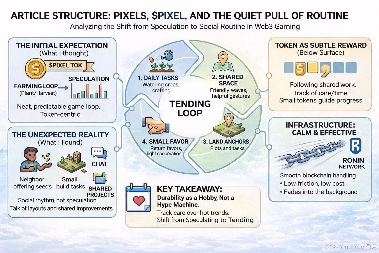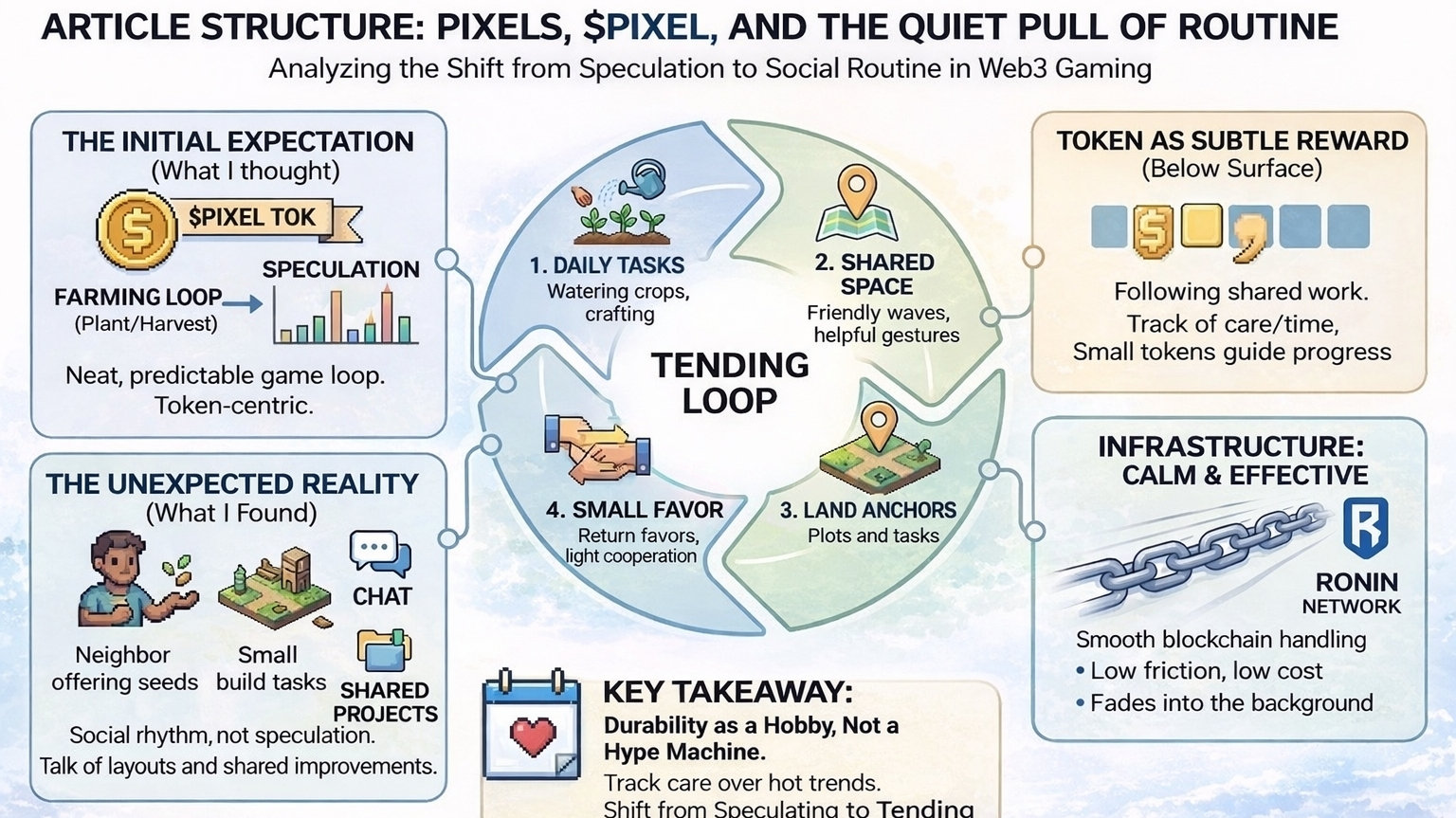 At first glance, Pixels felt comfortably familiar. A relaxed, social world on Ronin with neat plots, simple farming loops, a bit of exploration, and light creation. The token sat there like a marker—$PIXEL —pointing toward an economy I assumed I already understood. Plant, harvest, craft, sell, repeat. I figured I’d try it briefly, appreciate the polish, and move on. Web3 has plenty of bright, friendly spaces, and sometimes they start to feel like variations of the same loop.