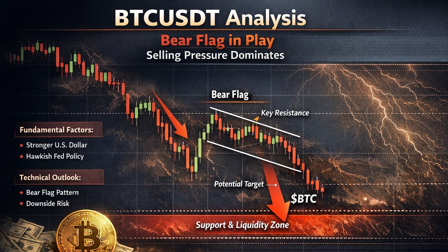 Pe grafice, BTCUSDT a întâmpinat recent o vânzare puternică, urmată de un rebound lent și slab. Acest comportament al prețului a format ceea ce pare a fi un model de continuare bearish, adesea denumit Bear Flag.