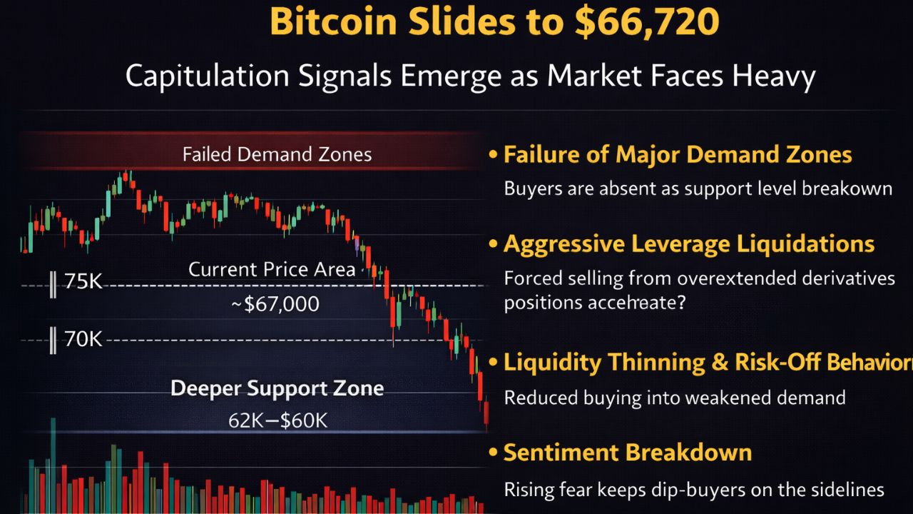 Bitcoin a continuat vânzarea astăzi, înregistrând un minim local aproape de $66,720, marcând o continuare profundă a tendinței descendente recente. Mișcarea reflectă stresul crescut al pieței, deoarece mai multe straturi de suport au cedat rapid, forțând traderii să reevalueze așteptările pe termen scurt.
