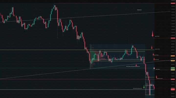 На вашем графике BTC, похоже, есть **сильная медвежья свеча поглощения** (bearish engulfing) в верхней части, за которой следует очень резкое падение, что совпадает с движением, которое вы показываете (большие красные свечи вниз, с продажами и прорывами уровней поддержки).