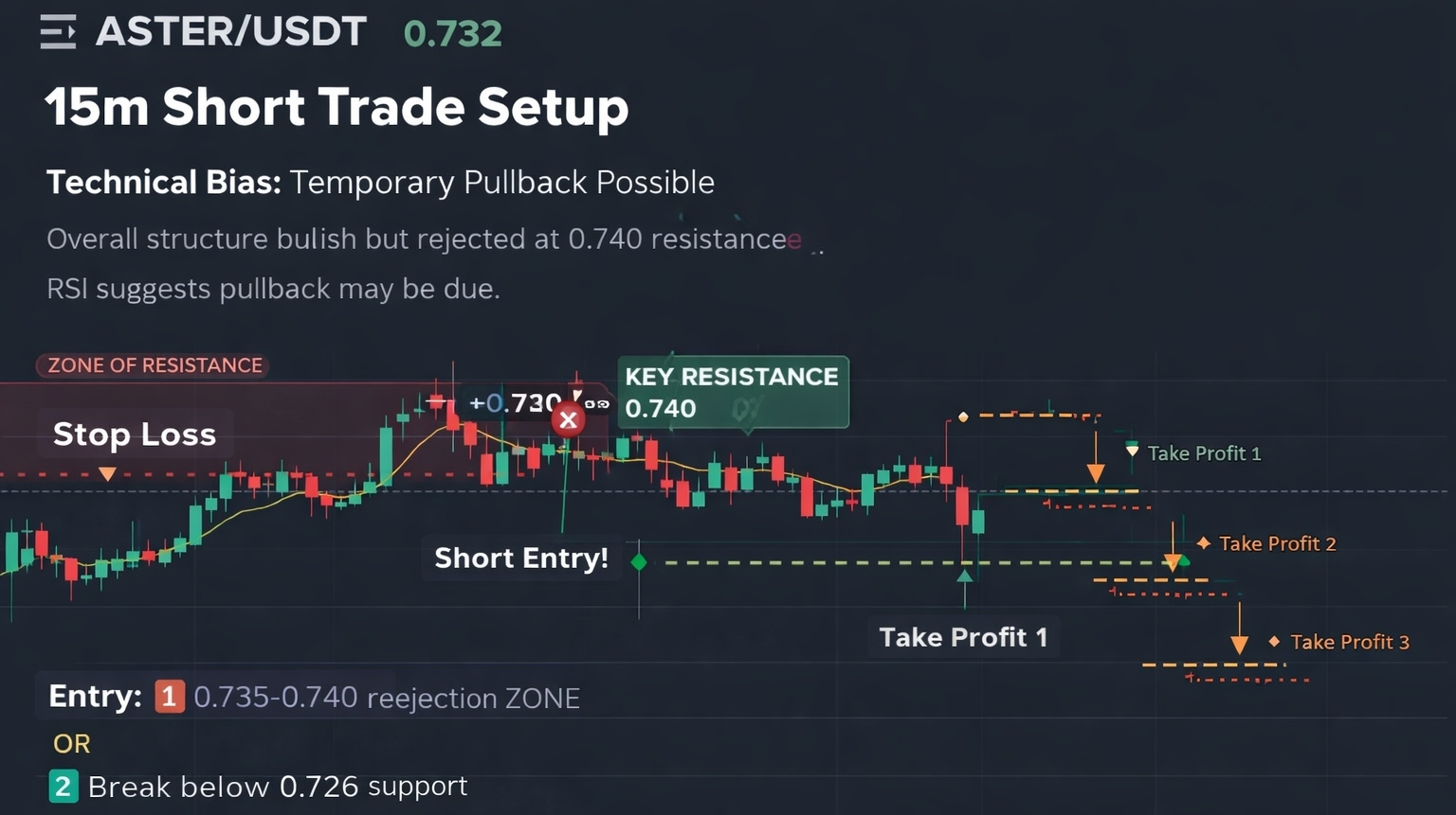 #ASTER Although overall structure is bullish, price recently faced rejection near 0.740 resistance. RSI above 60 suggests room for correction.