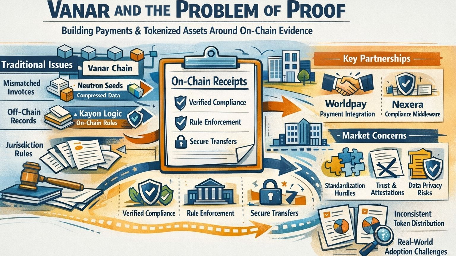 Если вы проводите время в мире платежей или токенизации, вы можете понять, почему эта идея так привлекает. Проблема в этих мирах обычно заключается не в том, как переместить ценность из A в B. Дело в беспорядке вокруг этого движения: счета, которые не соответствуют заказам, споры, зависящие от документов, переводы, которые разрешены только для определенных покупателей, правила юрисдикции, которые меняются, аудиторские следы, которые должны пережить вопросы регулятора через шесть месяцев. Большинство блокчейнов хорошо фиксируют, что перевод произошел. Они не созданы для того, чтобы нести доказательства, объясняющие, почему это было разрешено, какие условия были проверены или какая политика применялась в момент, когда деньги были перемещены.