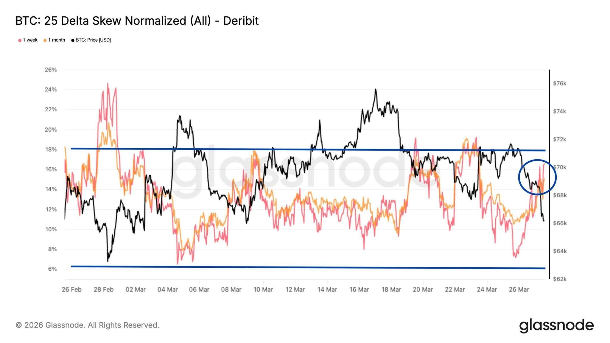 Скос вернулся к верхней границе своего месячного диапазона на уровне 16%, что отражает возобновленный спрос на пут-опционы.