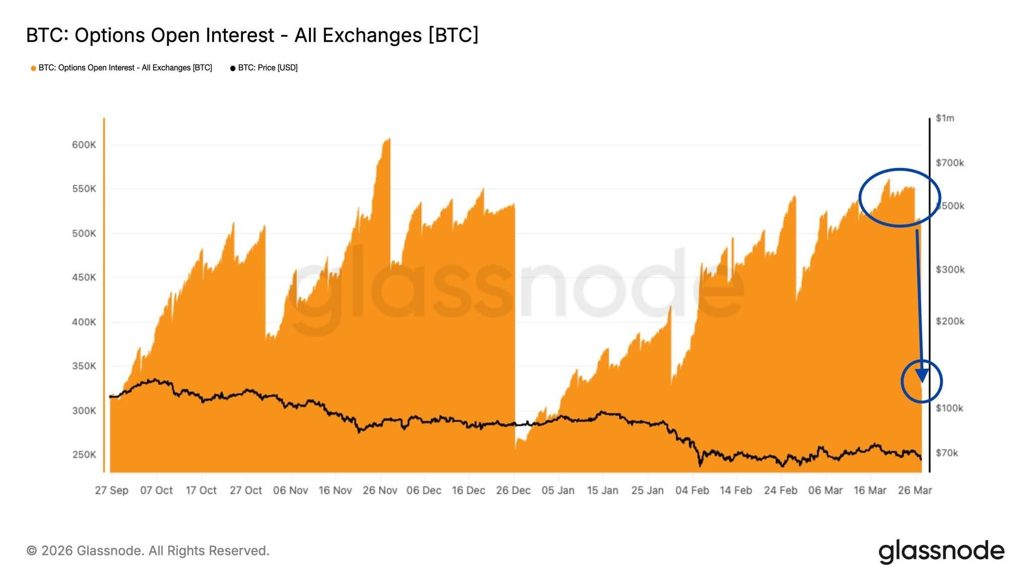 После сегодняшнего истечения открытый интерес по контрактам опционов на Биткойн резко упал с примерно 550,000 контрактов до 320,000 контрактов.
