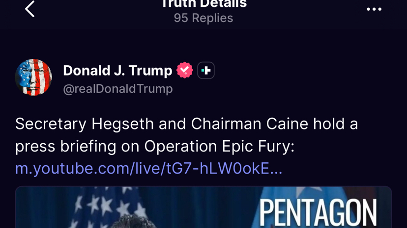 “Secretary Hegseth and Chairman Caine hold a press briefing on Operation Epic Fury”.