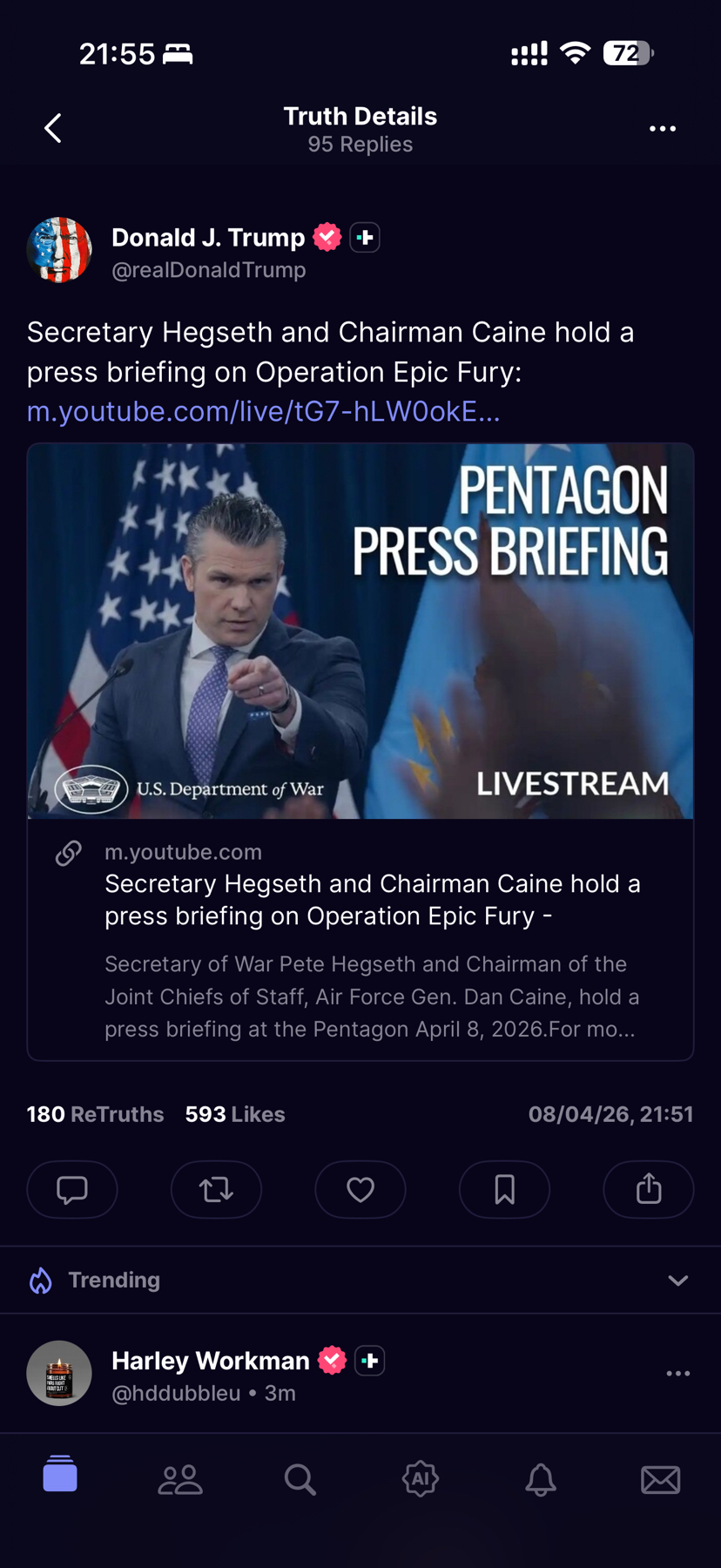 Trump đăng lại livestream chính thức của Department of War (tên mới của Bộ Quốc phòng Mỹ dưới thời Trump 2.0), với tiêu đề rõ ràng:
