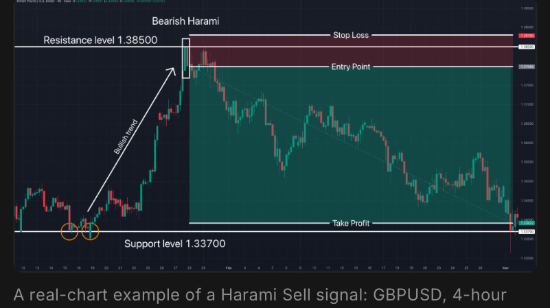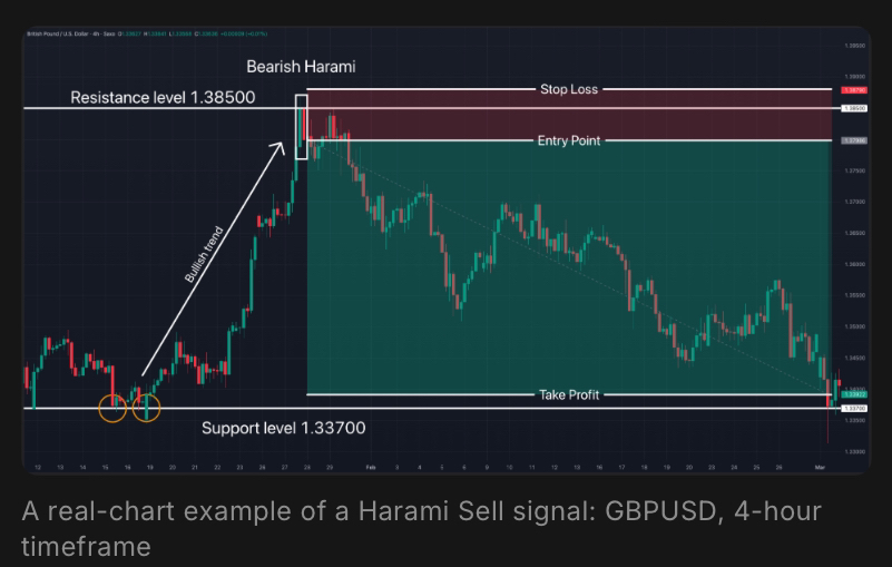 A Sell signal occurs when the Harami pattern completes below a resistance level and the second candlestick fully closes within the first one.