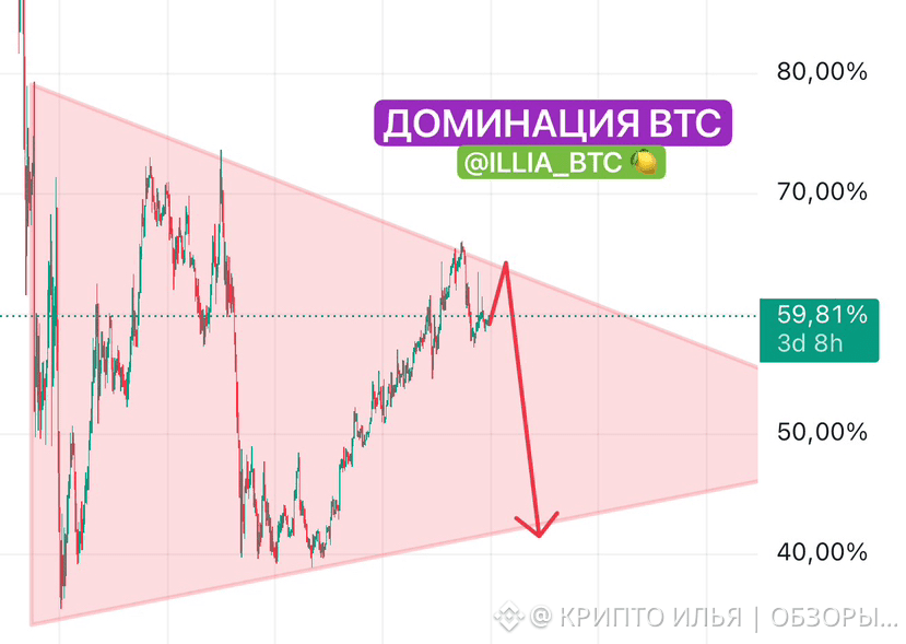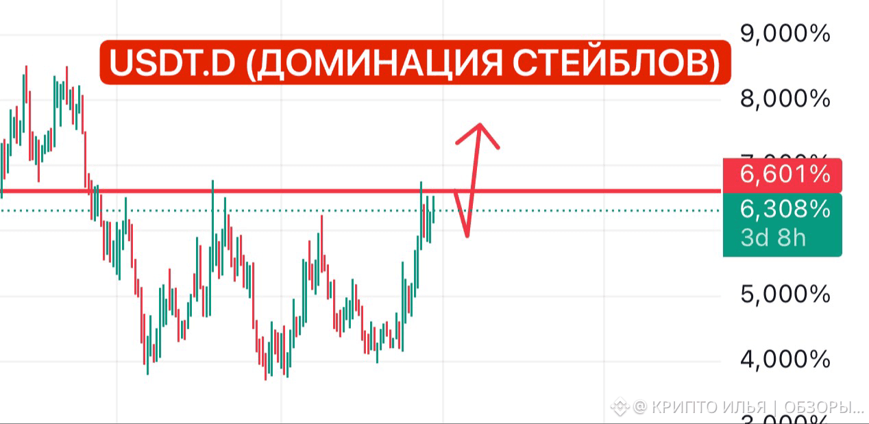 ⚠️Пока на недельных графиках альтов поджимаются поддержки (риск провала), на недельном графике USDT.D (доминации USDT, которая растет на коррекции рынка) поджимается сопротивление. От него могут быть отскоки (временные отскоки рынка), но вопрос времени, когда это сопротивление будет пробито (хотя бы резким сквизом), что позволит отработать всем «шортовым картинам» на графиках и возможно, позволит дорисовать вторую вершину, разворотной паттерн «М» на глобальном графике доминации биткоина (BTC.D)