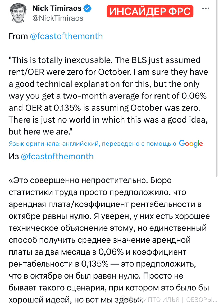 ➡️Инсайдер ФРС США из Twitter Nick Timiraos написал, что: «Бюро трудовой статистики опубликовали некорректные данные, судя по расчетам, они приравняли рост арендной платы за октябрь к 0, хотя в октябре аренда продолжила расти. Жилищные расходы составляют треть индекса потребительских цен, поэтому годовая инфляция теперь выглядит намного ниже реальной»