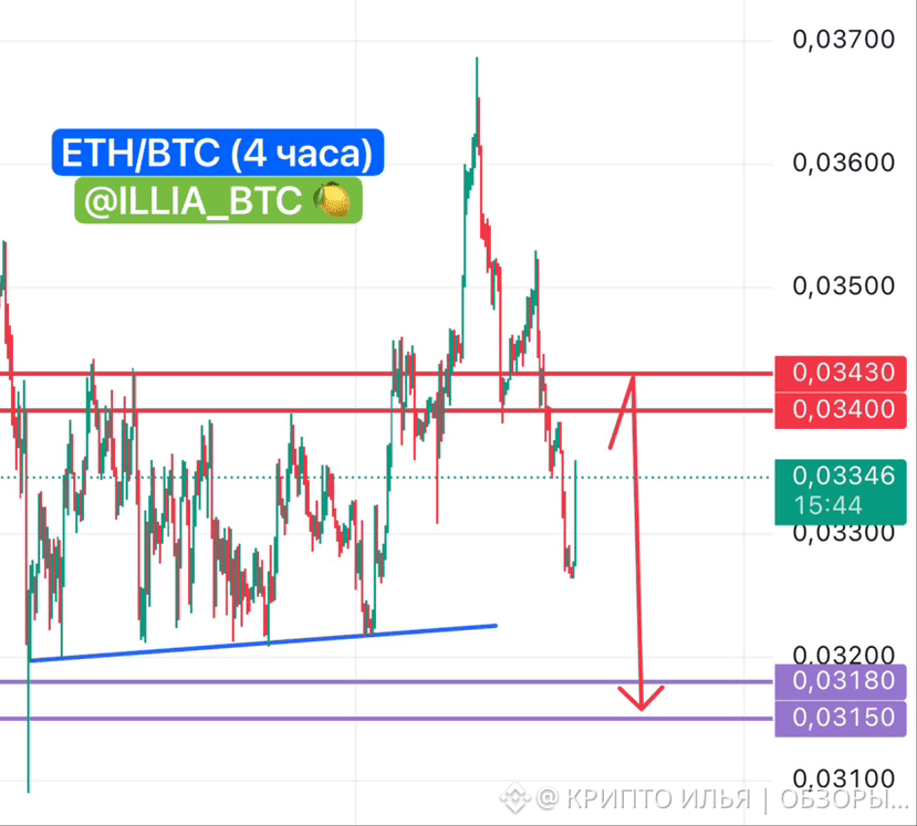 📈Если посмотреть на локальный график $ETH в паре к $BTC , то цена вполне может пойти снимать накопленную ликвидность ниже, на значениях: 0,0318 и 0,0315, при этом, допускается в рамках этого отскока приход к сопротивлению: 0,034 - 0,0343 (только если цена уйдет выше - это будет бычий признак за продолжение роста ETH в паре к BTC, до тех пор, в любой момент может получиться «подстава»)