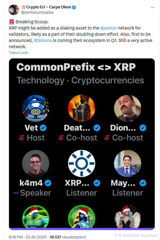 Eri made the disclosure shortly after an X Space event titled CommonPrefix <> XRP, which featured prominent community voices, including Vet, an XRPL validator, and Dionysis Zindros, the CEO of Common Prefix. Following the discussion, Eri revealed that Axelar intends to deepen its XRP integration by enabling XRP staking.