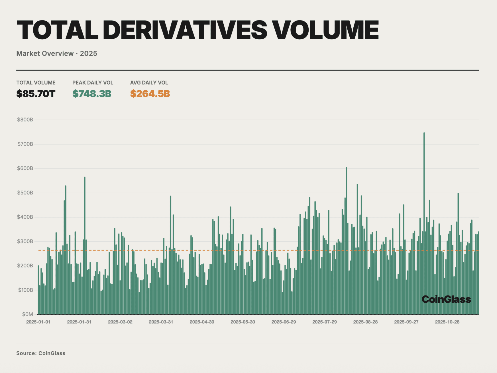 Объем криптовалютных деривативов достиг рекорда в 85,7 трлн долларов в 2025 году, в среднем 264,5 миллиарда долларов в день