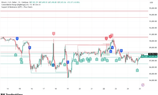 Криптовалютный рынок сегодня проявляет осторожность, с биткойном $BTC , торгующимся около $87,000–$88,000 после недавней консолидации. Эфириум $ETH держится около $2,900–$2,950. После массового истечения опционов на сумму $27 миллиардов на Deribit рынок остается в диапазоне между $85k–$90k для $BTC , под влиянием праздничной ликвидности и распределения в конце года. Недавний всплеск на паре BTC/USD1 на Binance кратковременно показал $24,000, но это была просто низкая ликвидность — не настоящий крах, с фактической ценой, остающейся стабильной выше $87,000. Вот несколько реальных графиков цен на биткойн с декабря 2025 года, показывающих консолидацию вокруг уровня $87,000.