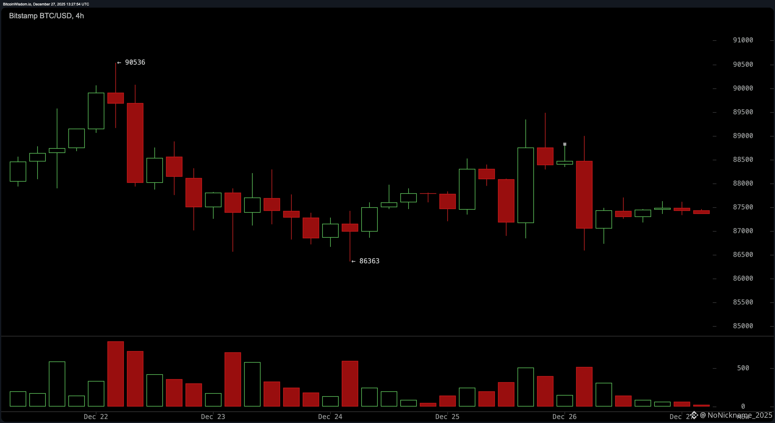 Диапазон узкий — между $87,000 и $87,500 — а объем? Практически шепчет. Это может быть классическая зона накопления, готовящаяся к прорыву выше $88,000, или же это может быть хитрый медвежий флаг, готовый к еще одному витку вниз, если $86,000 рухнет.