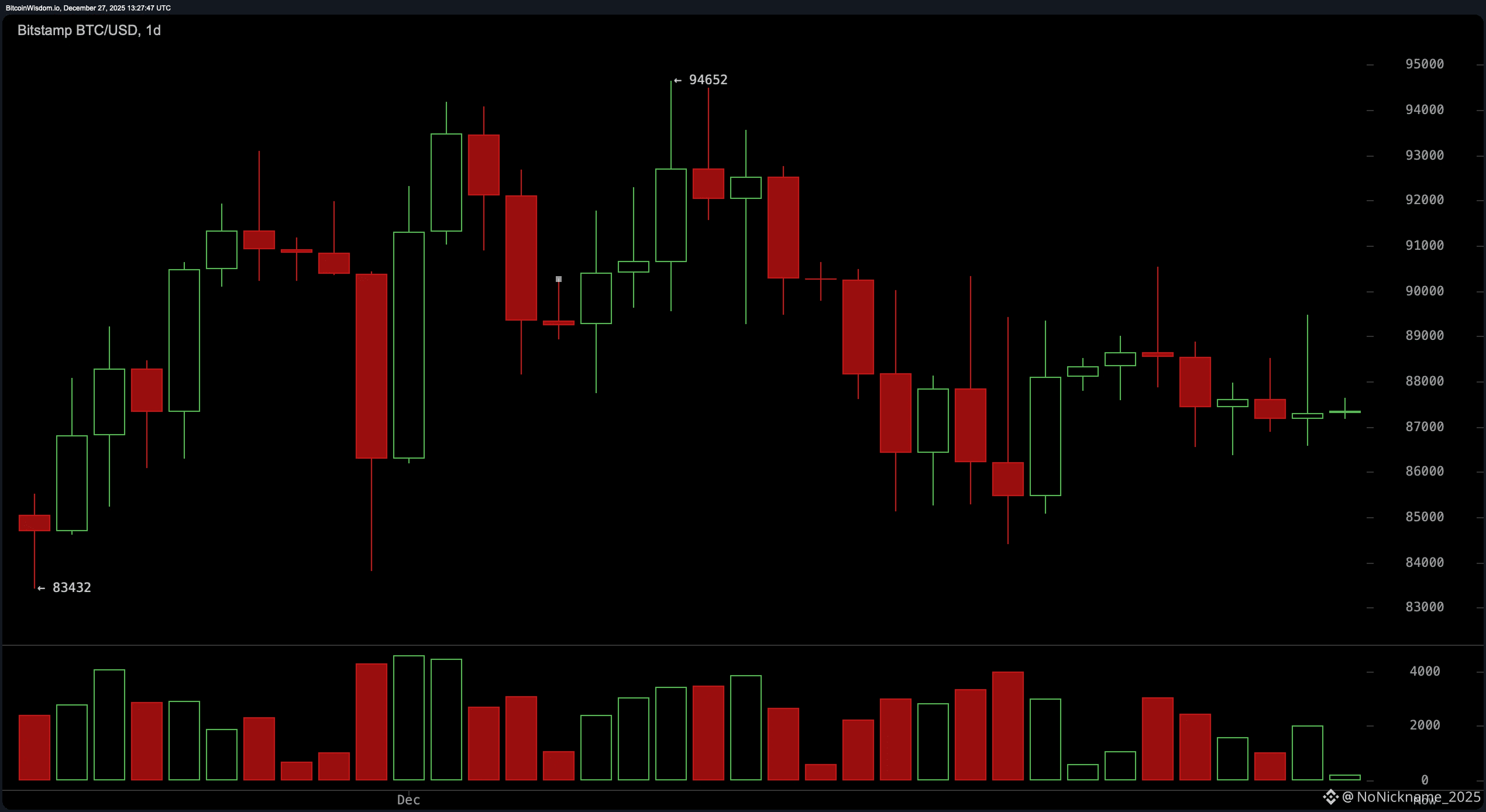 На дневном графике биткоин, похоже, шьет себе мантию из пониженных максимумов и пониженных минимумов — классическая нисходящая структура, намекающая на медвежьи настроения, но пока без драматичного входа. После достижения пика около $94,652, цена неспешно скользнула вниз в зону $87,000–$88,000, где теперь тихо гудит.