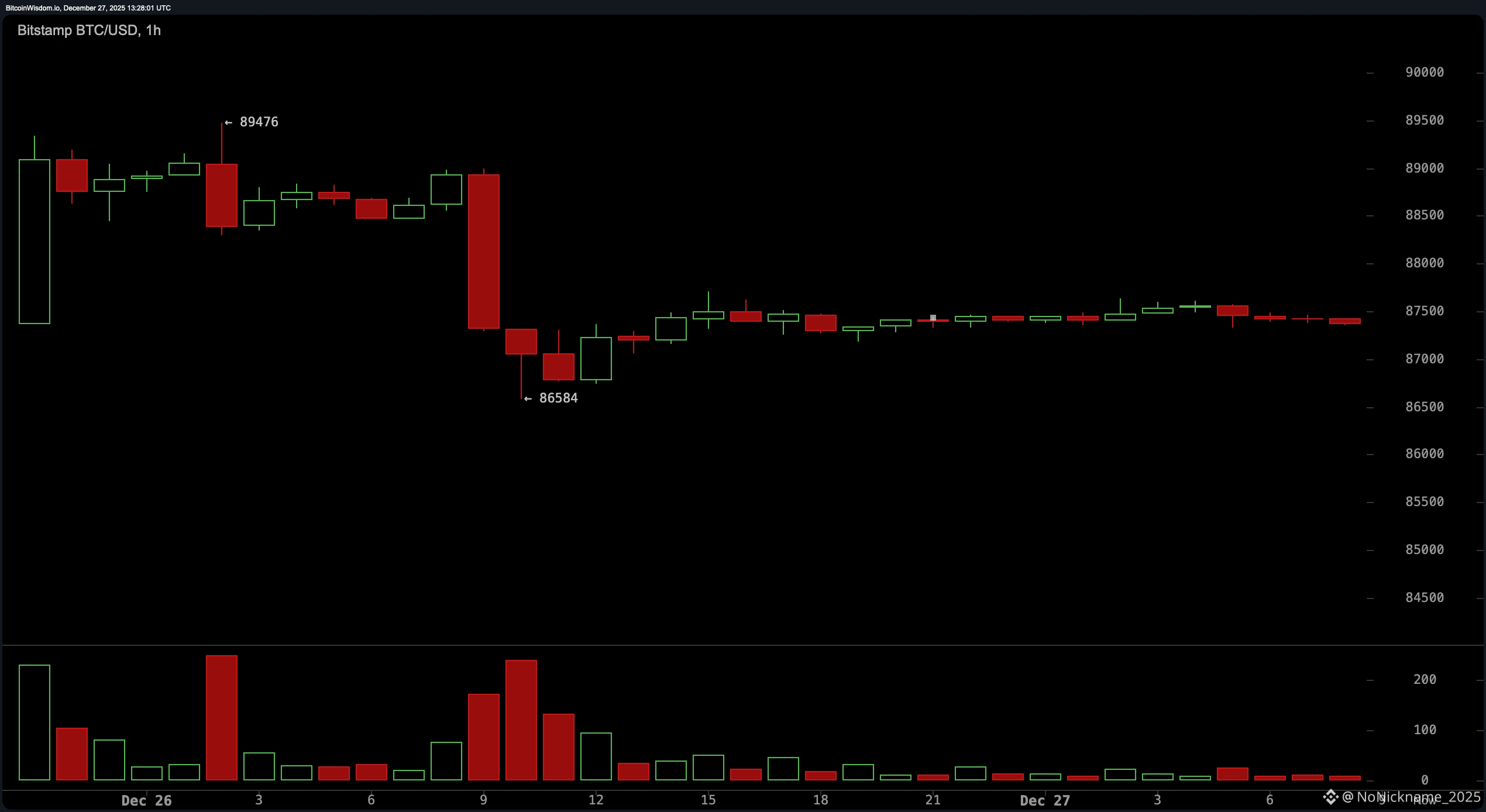 При увеличении до 1-часового графика складывается ощущение, как будто вы входите в криптографический туман. Резкое падение с примерно $89,400 до $86,500 встряхнуло ленту, за которым последовали ценовые действия, которые можно описать как… вежливо нерешительные.