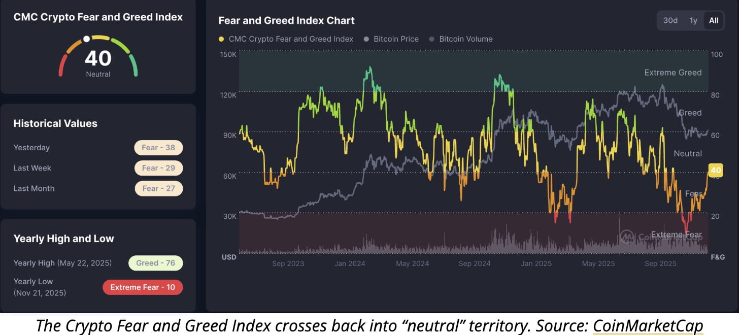 Chỉ số “Sợ hãi và Tham lam trong Crypto” của CoinMarketCap — một thước đo cảm xúc của nhà đầu tư được theo dõi rộng rãi — đã chuyển sang “trung lập” vào Chủ nhật lần đầu tiên kể từ tháng 10, báo hiệu rằng nỗi sợ hãi trên thị trường có thể đang giảm bớt ngay cả khi niềm tin lạc quan vẫn còn yếu.