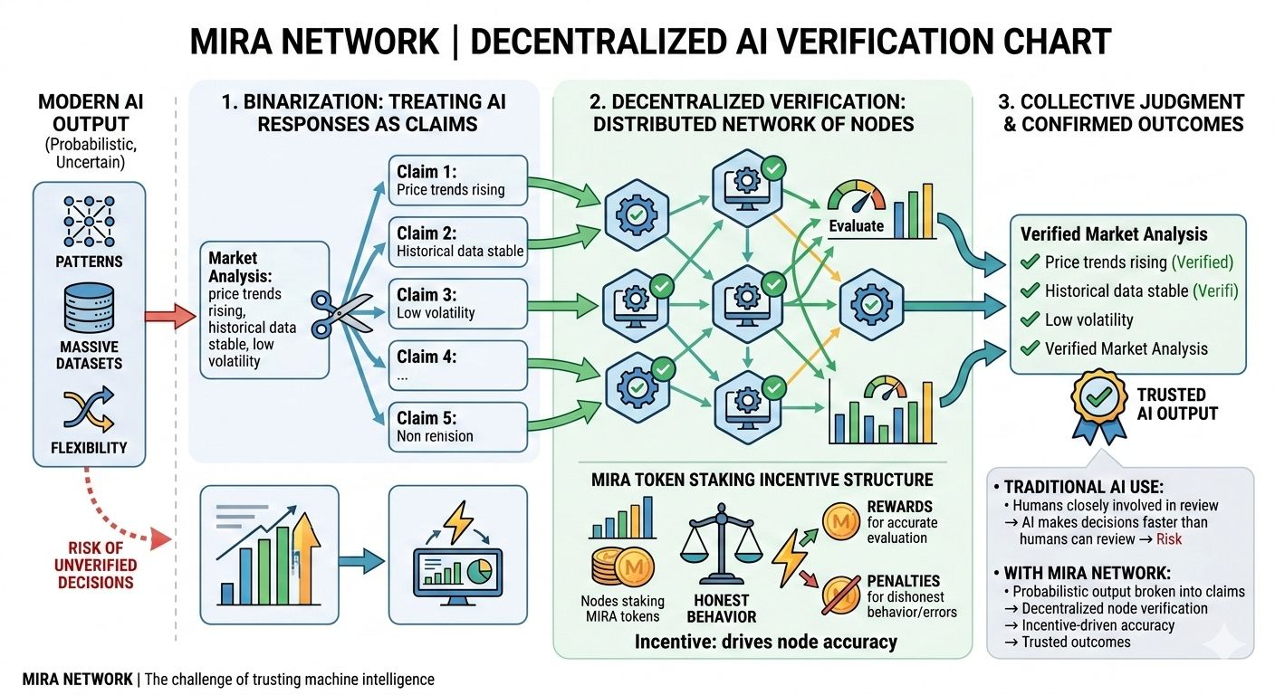 Instead of simply trusting the machine there needs to be a process that confirms whether the reasoning behind an output is sound. That is the problem Mira Network attempts to address.