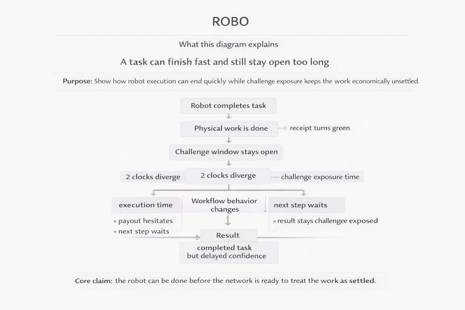 Nhiều hệ thống nói về sự hoàn thành như thể hành động cuối cùng của robot và sự tự tin của mạng lưới đến vào khoảng thời gian tương tự. Robot thực hiện công việc. Một biên lai đến. Một kết quả có sẵn. Tốt. Nhưng một khi một khoảng thời gian thách thức vẫn mở lâu hơn nhiều so với thời gian thực hiện, ý nghĩa của "đã hoàn thành" bắt đầu phân tách. Một lớp nói rằng robot đã hoàn thành. Một lớp khác nói rằng kết quả vẫn đang sống trong một khoảng thời gian mà sự đảo ngược hoặc tranh chấp có thể thay đổi những gì bất kỳ ai muốn làm tiếp theo.