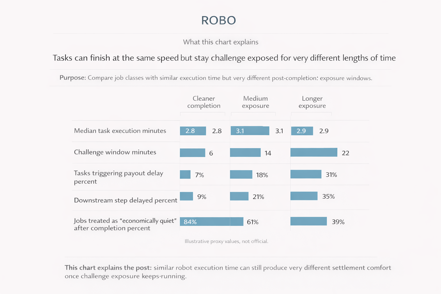 Tôi quan tâm đến $ROBO chỉ sau thời điểm đó. Không phải như một câu chuyện token chung chung. Tôi quan tâm liệu giao thức có thể làm cho sự phơi bày thách thức trở nên rõ ràng đủ để người dùng nghiêm túc không phải định giá nó một cách riêng tư. Sự rõ ràng tốt hơn về thời gian mà nhiệm vụ vẫn mở về mặt kinh tế sau khi robot đã xong. Tín hiệu tốt hơn cho các loại công việc nào thực sự yên tĩnh sau khi hoàn thành và loại nào vẫn mang theo một khoảng thời gian thi đấu sống. Kỷ luật tốt hơn để sự bảo vệ không lặng lẽ trở thành kéo dài với thương hiệu sạch hơn.