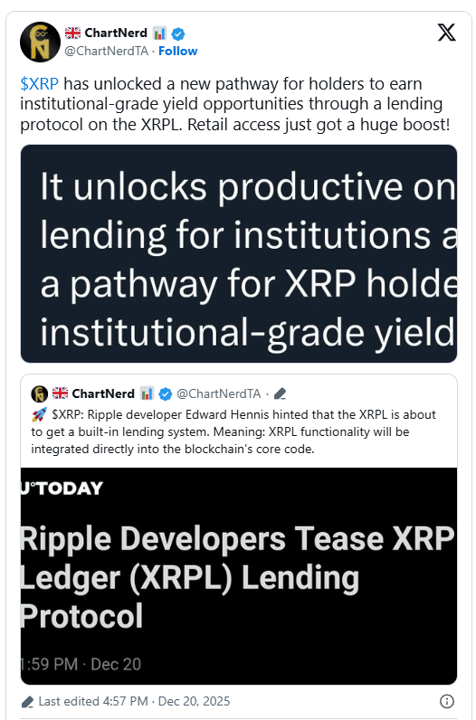 $XRP ChartNerd (@ChartNerdTA), một nhà phân tích crypto nổi tiếng, đã công bố một bài viết mới nêu bật sự thay đổi trong cách các chủ sở hữu XRP có thể tương tác với XRP Ledger. Ông mô tả sự phát triển này như một con đường mới cho phép các chủ sở hữu kiếm lợi nhuận thông qua một giao thức cho vay được xây dựng trực tiếp trên XRPL.