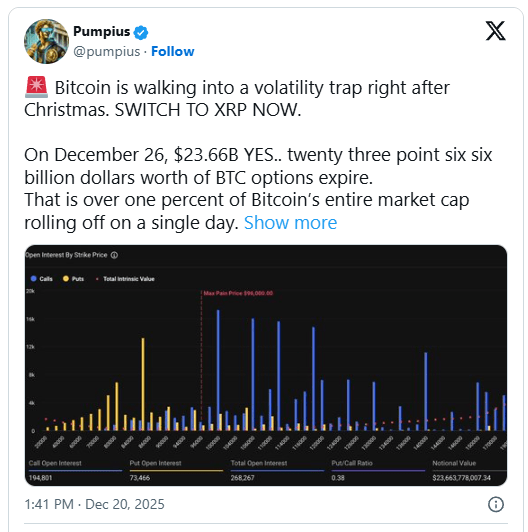 Pumpius đã kết thúc bằng cách củng cố nguyên tắc cốt lõi của mình. Anh ấy theo dõi định vị, không phải tiếng ồn. Khi anh ấy xoay chuyển, anh ấy làm điều đó sớm. Bài viết của anh ấy lập luận rằng việc hiểu cấu trúc phái sinh trước khi nó xuất hiện trên biểu đồ giá sẽ mang lại cho các nhà giao dịch một lợi thế. Trong trường hợp này, cấu trúc đó là lý do đã khiến anh ấy ưa chuộng XRP hơn Bitcoin khi năm 2025 kết thúc.