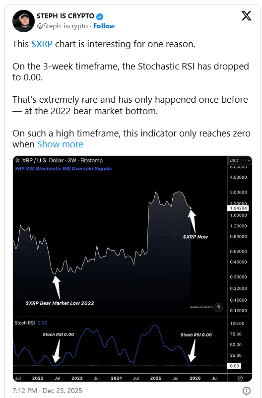 Trên khung thời gian ba tuần, Stochastic RSI của XRP đã giảm xuống 0,00. Đây là một chỉ số cực đoan mà hiếm khi xảy ra trên một khung thời gian cao như vậy, nơi các chỉ số di chuyển chậm và phản ánh các lực lượng thị trường rộng lớn hơn thay vì tâm lý ngắn hạn. Theo Steph, lần cuối cùng điều kiện chính xác này xuất hiện là tại đáy thị trường gấu năm 2022.