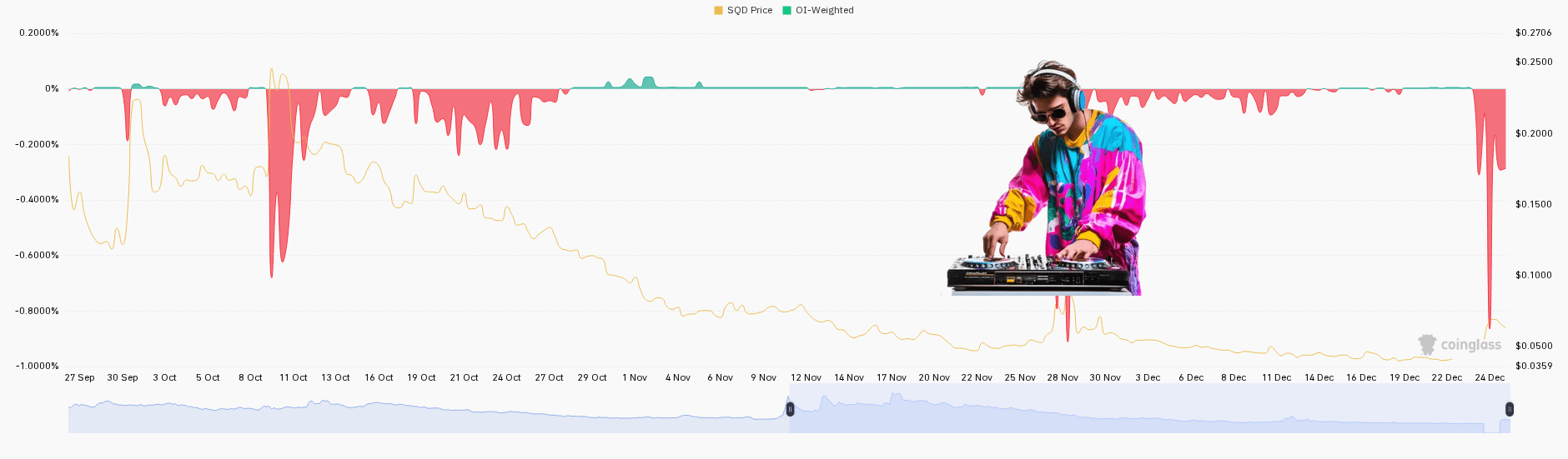 Được rồi, mọi người, hãy nói về SQD, vì biểu đồ này đang gào thét! Thật là một màn trình diễn tàn bạo từ mức cao cuối tháng Chín gần $0.27, xoáy xuống mức $0.0359. Đường màu vàng kể một câu chuyện về sự giảm liên tục, một sự giảm giá thực sự, nhưng chính chỉ số OI-Weighted mới thực sự thắp sáng nỗi hoảng loạn. Chúng ta đã thấy những dấu hiệu của rắc rối với những cú lao xuống màu đỏ dưới zero trước đó, nhưng cú rơi thảm khốc, bên bờ vực từ giữa tháng Mười Hai? Đó không chỉ là một cú giảm, đó là một sự kiện đầu hàng hoàn toàn, một cú bóp ngắn ngược lại, hoặc có thể chỉ là sự thanh lý khổng lồ. Hành động giá ở đây là một tín hiệu rõ ràng của áp lực giảm giá cực độ, với gần như không có mầm xanh nào để nói đến. Nếu bạn đang nắm giữ, bạn đã cảm nhận được nỗi đau; nếu bạn đang theo dõi, bạn đã thấy thị trường di chuyển, rất lớn. Đây không dành cho những người nhút nhát, đó là một chiến trường ở ngoài kia, và SQD vừa bị cán qua.