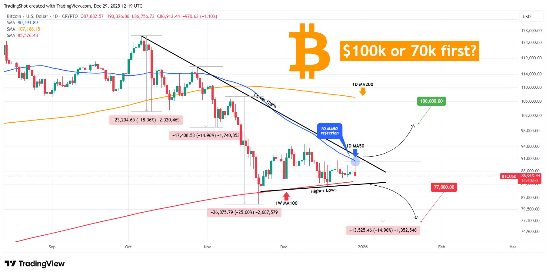 Kết quả là, nếu giá phá vỡ trên đường xu hướng Lower Highs, chúng tôi mong đợi một đợt phục hồi ngược xu hướng vào đầu năm 2026 để kiểm tra MA200 1D (đường xu hướng màu cam) và điều này ít nhất là $100000, giống như BTC đã làm trong tất cả các chu kỳ gấu trước đó. Nếu ngược lại, đường xu hướng Higher Lows phá vỡ trước, chúng tôi mong đợi một sự giảm tối thiểu -14.96% (chuỗi giảm ít nhất kể từ khi bắt đầu chu kỳ gấu) nhắm đến $77000.