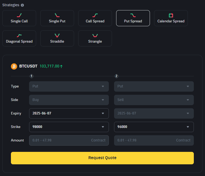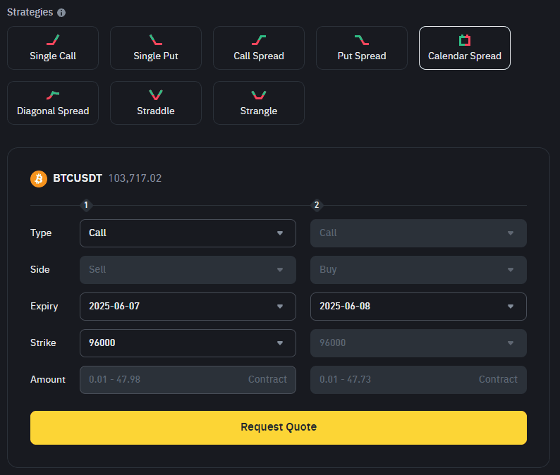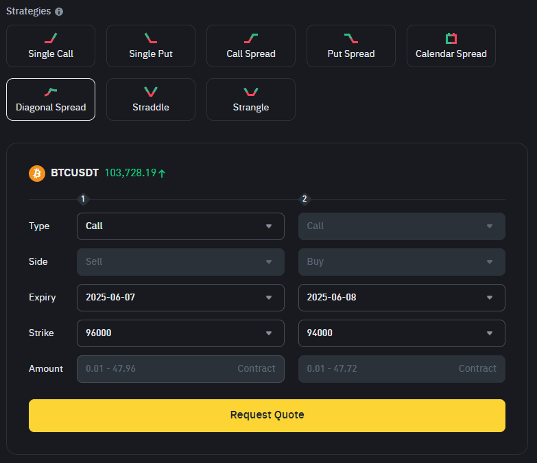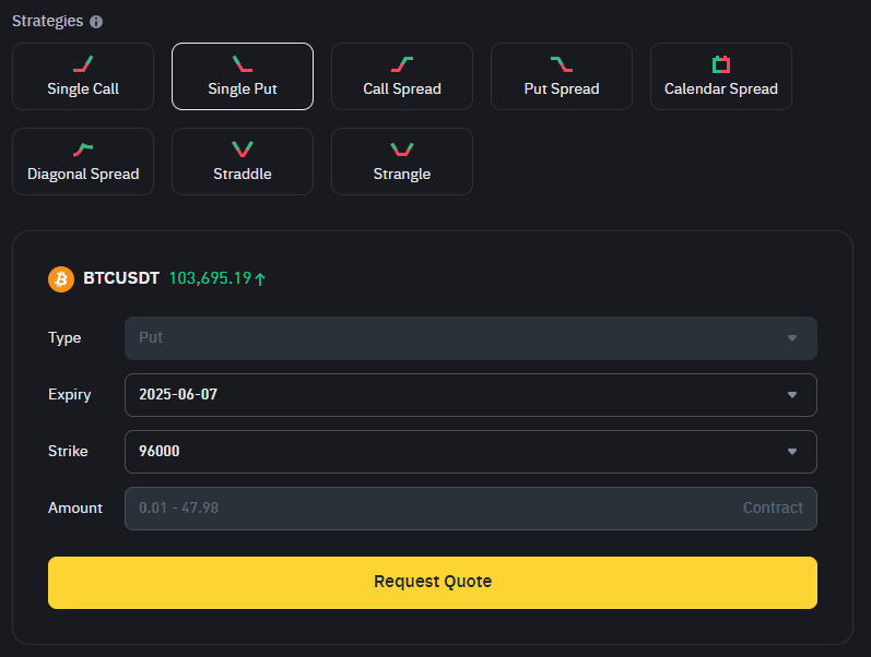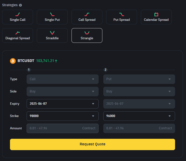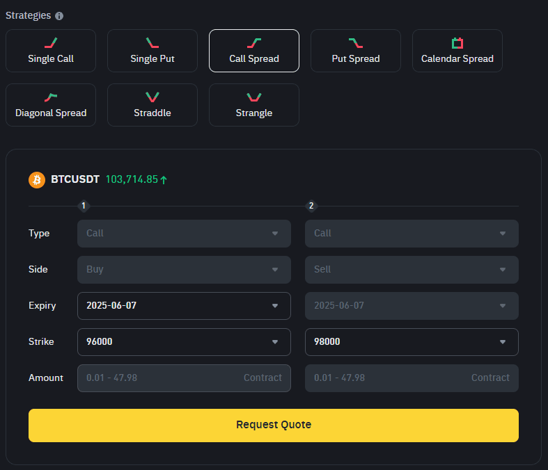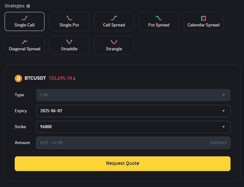 Binance Options RFQ cho phép các nhà giao dịch yêu cầu báo giá cạnh tranh cho các chiến lược có cấu trúc, cung cấp thanh khoản sâu hơn và giá cả rõ ràng hơn. Dưới đây là tám chiến lược thường được sử dụng trên nền tảng, từ các giao dịch hướng đi đơn giản đến các thiết lập phức tạp hơn về độ biến động và thời gian.